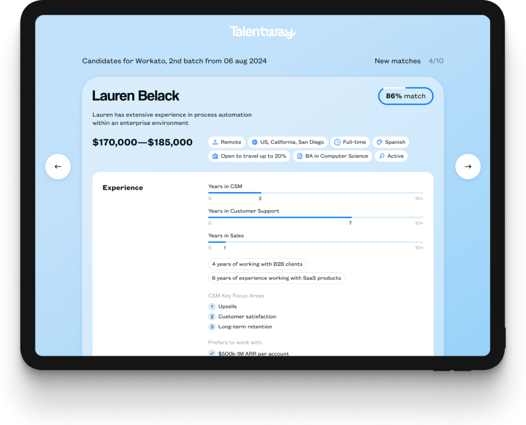 Talentway’s pre-vetted community of CSMs guarantees you’ll never have to sift through hundreds of (mostly unqualified) resumes or switch between job boards.